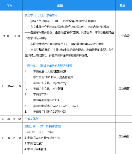 丰田汽车自2008年起,一直为全球排名第一的汽车生产厂商。2018年年末,世界品牌实验室编制的《2018世界品牌500强》揭晓,丰田排名第9位。自2000年进入中国以来,丰田已在中国的8个省和直辖市设立了9家独资公司、15家合资公司,拥有40,000余名中国员工。其一贯秉承的丰田TPS,涵盖了准时化、自动化、标准化、精益化等各种理念,已经成为全世界精益生产的标杆模板,几乎应用于所有行业。