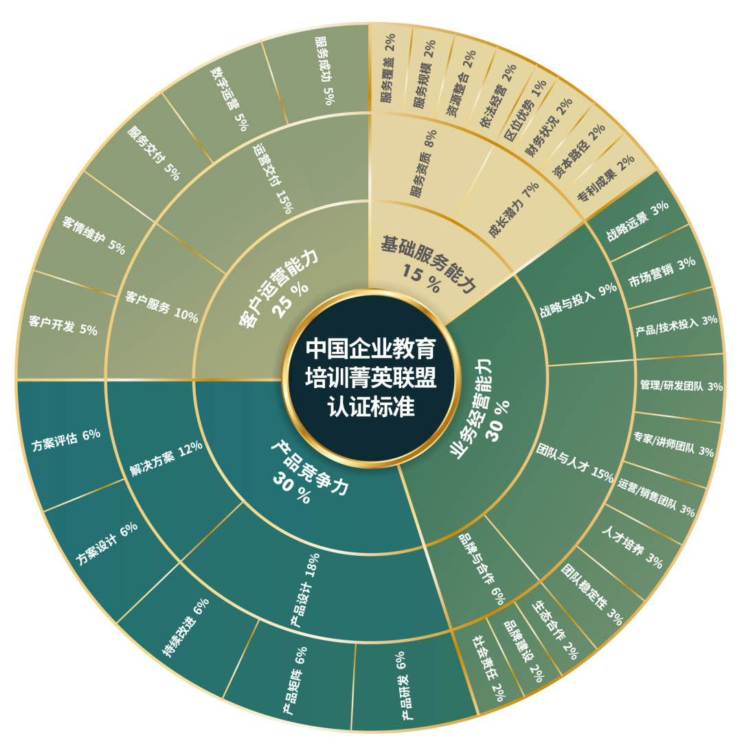 近30位来自企业、高校、媒体与行业协会的资深专家与学者,经数轮研讨、多次迭代,综合各方建议,制定“中国企业教育培训菁英联盟认证标准”。该标准围绕基础服务能力、业务经营能力、产品竞争力,以及客户运营能力4大一级维度建立。从服务资质、成长潜力、战略与投入、团队与人才、品牌与合作、产品设计、解决方案、客户服务、运营交付9大二级维度出发,覆盖29项三级指标,以及近百个关键要素,考察企业培训机构的综合能力。