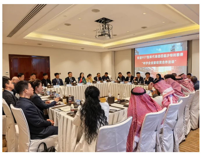 抵达沙特阿拉伯首都利雅得的首日,为了加速推动中沙两国在经贸发展与学术创新领域的交流合作,博石教育、FET智库携手沙特阿拉伯利雅得商会及中国阿拉伯非洲商务联盟理事会,于12月8日上午联合举办了“中沙企业家经贸合作洽谈会”。此次盛会荣幸邀请到了沙特阿拉伯Abdullah bin Sultan亲王殿下的顾问、乍得共和国驻沙特经贸大使、沙特阿拉伯纳耶夫亲王殿下的中国商务特使、Bawani建工集团副首席执行官、GULF油气服务公司总经理等十位沙特贵宾,与中国企业家代表团共18人共聚一堂,共谋合作新篇章。